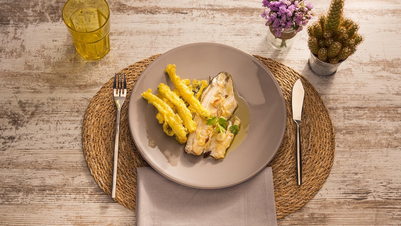 Emplatamos colocando la tempura de verduras y los lomos de lubina y los regamos con la salsa donostiarra.