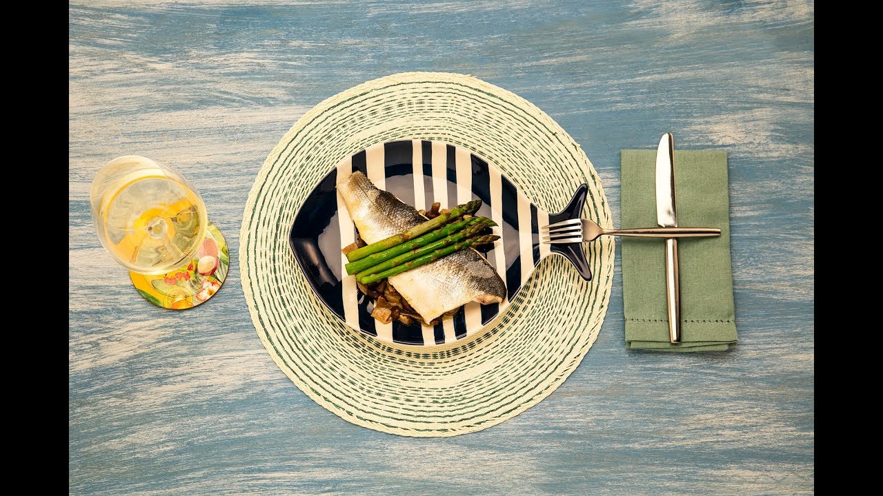 Sobre el plato, colocamos una base de espárragos y setas y, sobre ella, ponemos la lubina.