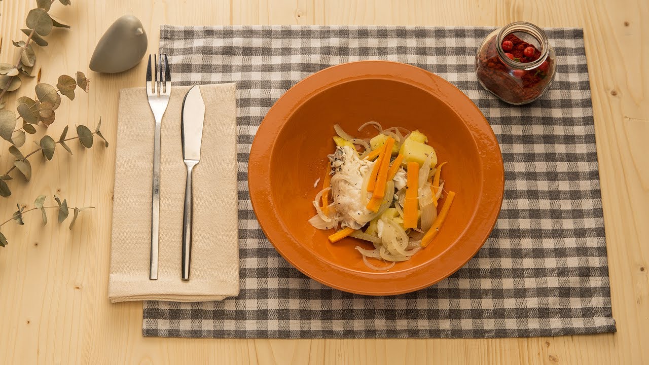 En un plato ponemos las patatas y los lomos de las lubinas y las bañamos con un poco de escabeche.
