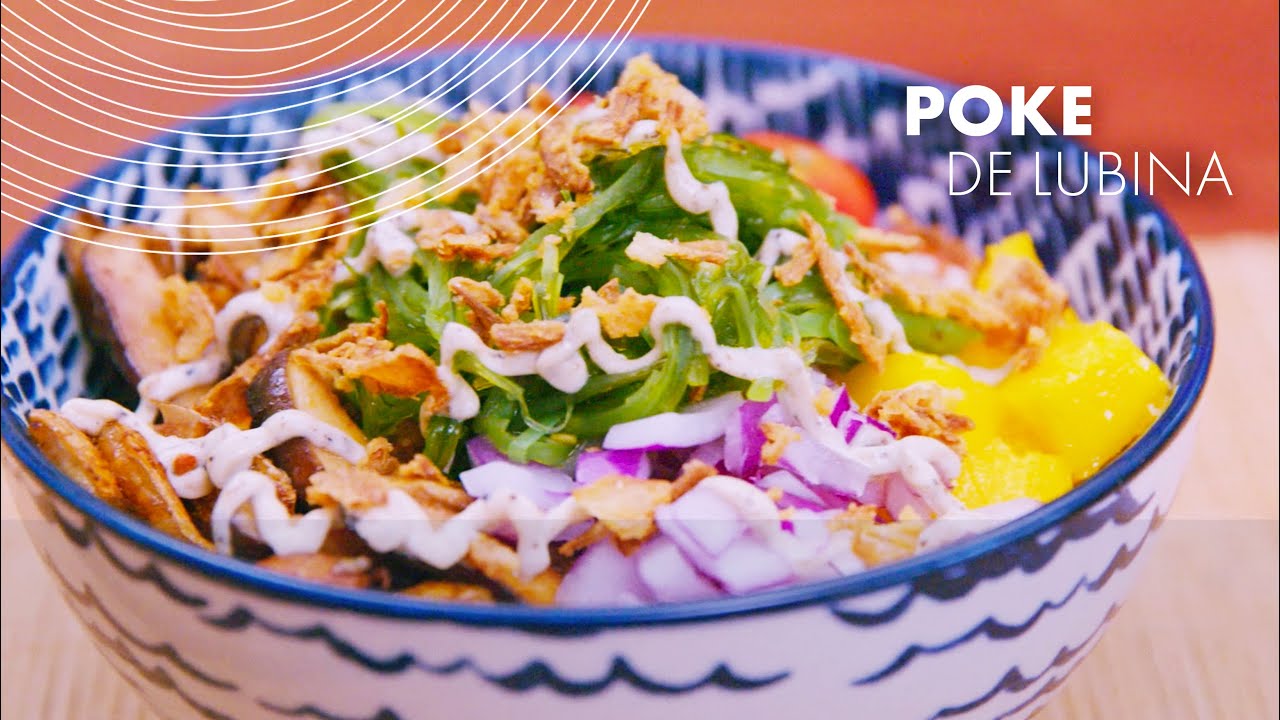 Ahora es momento del montaje. Hacemos una cama de arroz de sushi, previamente cocido, y por encima ponemos las setas salteadas y la lubina junto a los ingredientes cortados. En el centro añadimos el alga wakame, decoramos con la salsa y encima colocamos el topping de cebolla crujiente.